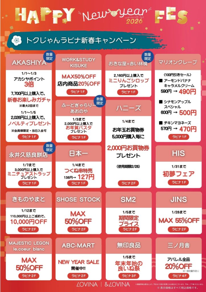 TOP イベント・キャンペーン ショップガイド フロアガイド 施設案内 決済方法 アクセス・駐車場 免税対象店舗 求人情報 お知らせ お問い合わせ 会社案内 個人情報の保護について JR東日本グループコンプライアンス相談窓口 ウェブサイトのご利用について ソーシャルメディアポリシー ホーム イベント・キャンペーン 【ラビナ・&LOVINA】初売りスタート!! 【ラビナ・&LOVINA】初売りスタート!! 2026/1/2(金) ラビナ・&LOVINAのお得な新春福袋・新春キャンペーンをご紹介! 年に一度のお得な期間となっております。ぜひ年始はラビナ・&LOVINAでのお買い物をお楽しみください✨ 一覧へ